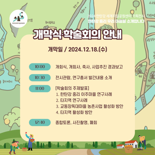 2024. 한탄강 세계지질공원센터 기획전시 페이지 정보 작성자 한탄강지질공원센터 댓글 0건 조회 1,322회 작성일 24-12-19 14:30 본문 2024. 한탄강 세계지질공원센터 기획전시 "한탄강 중리 우리 마을을 소개합니다."한탄강 홍수조절댐 건설로 인한 이주 마을 이야기- 전시기간 : 2024.12.18.(수) ~ 2025.8.31.(일)- 장소 : 한탄강 세계지질공원센터(포천시 영북면 비둘기낭길 55)- 문의 : 031-538-3030 목록 이전글2024. 경기북부 지역문화 특성화 사업 / 가고 싶은 경기북부 지역공감 `여기도 아트홀` 24.12.20 다음글2024. 포천 한탄강 다함께 걸어요 (주상절리길 완주 인증제) 24.12.09